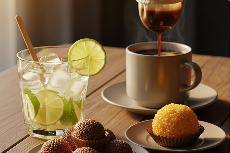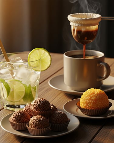 Brigadeiros, quindins, café brasileño y caipirinha — una colección de delicias que endulzan y refrescan el alma.